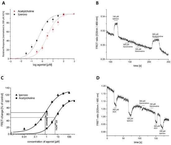 Ligand characterization at the M1 and M2 muscarinic receptor sensors. (A) Concentration response curves of ACh (1) and Iperoxo (2) as calculated from FRET experiments using the M1 receptor sensor. Each ligand concentration is represented by an average value of at least 10 cells; (B) a FRET recording of the M1 receptor sensor stably expressed in HEK293 cells is illustrated. Additionally, 100 micromolar Iperoxo (2), 300 micromolar ACh (1), and 100 and 300 micromolar Xanomeline (10), were applied as indicated at the appropriate time points by black bars above or below the recorded signal. (C) Concentration response curves of ACh (1) and Iperoxo (2) as calculated from FRET experiments using the M2 receptor sensor. Each ligand concentration is represented by the average value of at least 10 cells; (D) a FRET recording of the M2 receptor sensor stably expressed in HEK293 cells is illustrated. Additionally, 300 micromolar ACh (1), 100 micromolar Iperoxo (2), and 100 and 300 micromolar Xanomeline (10), were applied as indicated at the appropriate time points by black bars below or above the recorded signal.