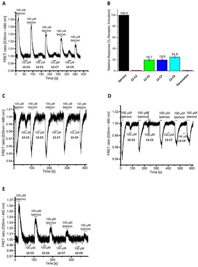 Evaluation of the Xanomeline/77-LH-28-1 hybrid ligands 12-Cn at the M1 (A); M2 (C); M4 (D); and M5 (E) muscarinic FRET receptor sensors stably expressed in HEK293 cells. One hundred micromolar Iperoxos (2) were used as a reference ligand throughout the recording, as indicated by black bars above the recorded signals. One hundred micromolar concentrations of the hybrid compounds 12-C3, 12-C5, 12-C7, and 12-C9 were applied as indicated at the appropriate time points by black bars below the recorded signal; (B) quantified maximal ligand-induced FRET response of compounds 12-Cn as a percent of control (100 μM Iperoxo) at the M1 receptor sensor. Each bar represents the average of at least 10 independent measurements.