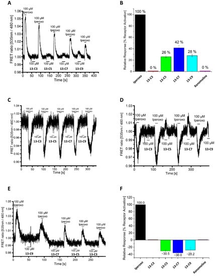 The same experiments were performed with the corresponding set of quaternary tetrahydropyridinium salts, 13-Cn (Figure 2), and the results are displayed in Figure 5. When compounds 13-Cn were investigated via FRET for their ability to induce a conformational change at the M1 receptor, a similar trend (Figure 5A) to that of the uncharged analogs 12-Cn (Figure 4A) was observed. Whereas hybrid 13-C3 with the shortest linker did not exhibit a FRET signal, the longer linker derivatives 13-C5, 13-C7, and 13-C9 induced a conformational change indicative of their agonistic properties. Signal quantification brought about a bell-shaped graph (Figure 5B), since a signal increase was observed for 13-C5 and 13-C7, followed by a decrease for 13-C9, characterized by the longest linker. These results clearly evidenced a linker-length-dependent receptor response with an optimal spacer length of approximately seven methylene groups (≈10.8 Å). Hybrid 13-C7 induced the largest conformational change at the M1 FRET sensor compared to all the other structural analogs, both of the quaternary ammonium 13-Cn series and of the tertiary amine 12-Cn series. The FRET investigation at the M2 receptor sensor revealed that the four 13-Cn compounds were not able to induce any conformational change (Figure 5C), displaying a similar trend to that of the corresponding uncharged set of derivatives 12-Cn (Figure 4C), the analog 12-C3 excepted. Figure 5D displays a FRET trace of hybrid 13-Cn at the M4 receptor sensor, and the bar graph in Figure 5F summarizes the corresponding FRET signals. Interestingly, at the M4 receptor, antiparallel signals for derivatives 13-C5, 13-C7, and 13-C9 were detected, with a clear FRET effect. Similar to the results obtained at the M1 FRET sensor, the activation pattern showed bell-shaped features. Once again, the signal intensity was dependent on the linker length, with the highest response corresponding to the 13-C7 hybrid containing a spacer with seven methylene groups. Analogously to the tertiary amines, hybrids 12-Cn, also hybrids 13-Cn did not affect the M5 subtype, and no significant FRET signal was obtained (Figure 5E).