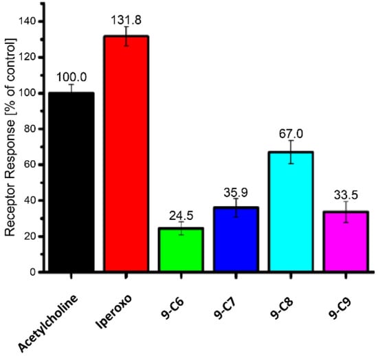 Moreover, a linker-length-dependent graded activation was evidenced by bitopic ligands 9-Cn (Figure 1), containing Iperoxo and a fragment of the allosteric modulator Naphmethonium 5, which were investigated by FRET at the M2 mAChR [13]. The best activation profile was displayed by hybrid 9-C8, characterized by a spacer chain of eight methylene groups. We re-examined the behavior of hybrids 9-C6, 9-C7, and 9-C8 [13] by adding new data obtained on the further elongated bitopic homolog 9-C9 [35]. Even for this group of ligands, FRET measurements evidenced a bell-shaped activation pattern (Figure 7), which resembles that of the positively charged methyl tetrahydropyridinium salt 13-Cn at the M1 mAChR.