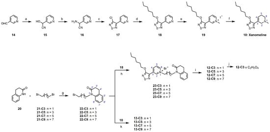 The synthetic approach for the preparation of target hybrids, such as tertiary amines 12-C3, 12-C5, 12-C7, and 12-C9 and ammonium salts 13-C3, 13-C5, 13-C7, and 13-C9 are illustrated in Scheme 1. We initially prepared the orthosteric pharmacophoric moiety Xanomeline 10 according to a known procedure [25,31]. In the presence of acetic acid, 3-pyridinecarboxaldehyde 14 underwent a Strecker-type reaction with trimethylsilyl cyanide to afford cyanohydrin 15. The reaction of 15 with ammonium chloride in ammonium hydroxide yielded the corresponding aminonitrile 16, which was then cyclized by treatment with disulfur dichloride in DMF and afforded the 3-chloro-4-(pyridine-3-yl)-1,2,5-thiadiazole intermediate 17. The latter was functionalized by nucleophilic substitution with 1-hexanol using sodium hydride in THF to provide intermediate 18. Next, Xanomeline 10 was obtained after the conversion of 18 to the corresponding quaternary pyridinium iodide 19 by reaction with methyl iodide in acetone, followed by the reduction in the aromatic positively charged heterocyclic ring to the corresponding 1,2,5,6-tetrahydropyridine by using sodium borohydride in methanol. The monobromo-3,4-dihydroquinolinone allosteric fragments 22-Cn were obtained through the reaction of the commercially available 3,4-dihydroquinolinone 20 with alkyl dibromides 21-Cn in the presence of sodium hydride, followed by heating at 50 °C in DMF.