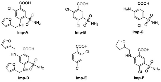 The European Pharmacopoeia (EP) 10.0 has registered six known furosemide impurities, i.e., impurities A–F (Figure 2) [16], and several articles have been reported on the stability behavior and impurities of furosemide [17,18,19,20,21,22]. However, impurity G has not been reported yet and the analytical methods in reported studies are mostly referred to EP 10.0 and the United States Pharmacopeia (USP) 43. The HPLC mobile phases described in EP for furosemide-related substances consist of potassium dihydrogen phosphate, cetrimide, and propanol. According to USP43, the HPLC mobile phases for the determination of furosemide-related substances are combinations of tetrahydrofuran, glacial acetic acid, and water (30:1:70, v/v/v) [23]. However, the ion-pair reagent used in EP may do irreversible harm to the chromatographic column and it is difficult to be removed from instruments. On the other hand, the use of a high proportion of tetrahydrofuran may adversely affect the health of the researchers and the instruments. The ideal analytical method should be fast, easy, robust, cost efficient, and relatively eco-friendly as it can be used not only by research laboratories but also by pharmaceutical companies [24].