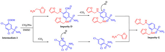 During the preparation of drugs, process-related impurities might be formed due to side reactions. Based on the synthetic route employed for the preparation of furosemide, the proposed formation pathway of impurity G was shown in Figure 4. There were two possible pathways to form impurity G. First, the C-Cl bonds of 2,4-dichloro-5-sulfonamidobenzoic acid (intermediate 2) were activated due to the existence of an electron-withdrawing group (sulfonamido group) in the benzene ring. In the presence of excess furylamine, impurity D was obtained in a disubstitution reaction, and then impurity D was decarboxylated at a high temperature (125 °C ≤ T ≤ 135 °C) to give impurity G [28,29]. In another pathway, intermediate 2 was decarboxylated first, then underwent a disubstitution reaction to give impurity G.