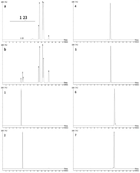 Total ion chromatograms of eight ginsenosides measured using ultra-high performance liquid chromatography–tandem mass spectrometry (ACQUITY UHPLC BEH C18 column; 2.1 × 50 mm, 1.7 μm). (a) Panax notoginseng flower, (b) standard. 1: NG R1, 2: Re, 3: Rg1, 4: Rb1, 5: Rc, 6: Rb2, 7: Rb3, 8: Rd.