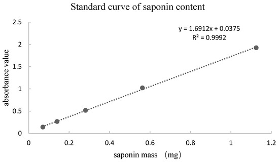 In this study, 50 g of PNF was extracted with 75% ethanol to obtain 22.04 g of extract, which exhibited a total saponin content of 32.58%, calculated using the calibration curve shown in Figure 2. Then, the 9.85 g extract was adsorbed with 50% ethanol by 197 g macroporous resin to obtain 4.40 g of eluted solid, in which the total saponins content was 62% and the enriched saponins mass was 2.73 g. The results indicate the validity of the extraction and purification methods, which increased the total saponin content by approximately two-fold.