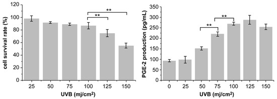 Effect of UVB irradiation intensity on cell viability and PGE-2 production. ** p < 0.01. UVB: Ultra-violet B, PGE-2: prostaglandin E2.