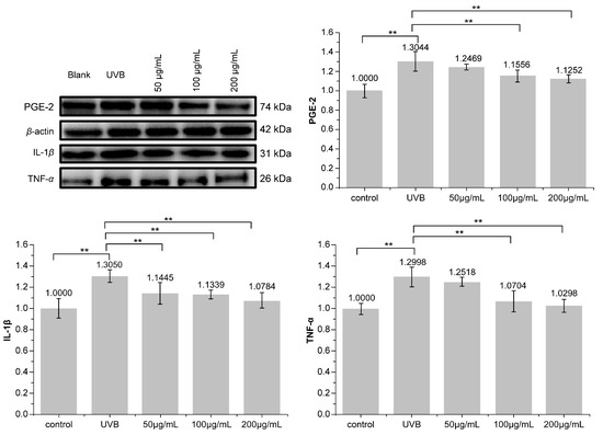 Western blotting was used to detect the secretion of PGE-2, IL-1β, and TNF-α in HaCaT cells. As shown in Figure 6, PNFS exhibited inhibitory effects on the expression of all three inflammatory factors. PNFS concentrations of 100 μg/mL and 200 μg/mL significantly inhibited the expression of inflammatory factors (p < 0.01). Thus, the Western blotting results were consistent with the ELISA results. Several previous reports have demonstrated that PGE-2 can increase UVB-induced skin inflammation and tumorigenesis, IL-1β can upregulate the production of matrix-degrading metalloproteinases (MMPs), which can cause photoaging, and TNF-α can promote apoptosis, lymphocyte activation, and hyperproliferative skin disorders. Therefore, the observed reduction in these inflammatory factors in HaCaT cells treated by PNFS treatment will not only alleviate skin inflammation but also prevent other skin damage caused by UVB irradiation, such as photoaging.