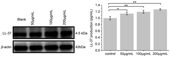 Effect of PNFS on LL-37 production determined using Western blotting. * p < 0.05, ** p < 0.01. PNFS: Panax notoginseng flower saponins.