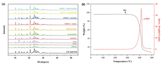 (a) PXRD patterns of TNBP raw material and crystalline samples obtained in different solvent systems. (b) TG-DTG curves of TNBP.