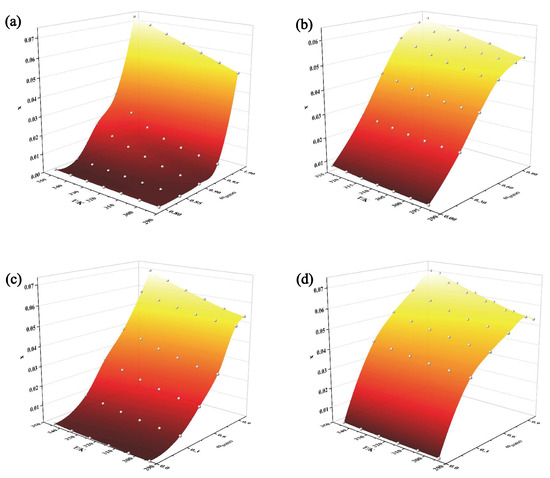 As DMSO is an excellent solvent for solubilizing TNBP, studying the solid–liquid phase equilibrium of DMSO with the four non-solvents (water, acetone, acetonitrile, and ethyl acetate) can provide more options for the crystallization process of TNBP. The experimental values of the molar fraction solubility of TNBP in four mixtures of DMSO with water, acetone, acetonitrile, and ethyl acetate at different temperatures and mass fractions are shown in Table 2, Table 3, Table 4 and Table 5 and plotted in Figure 4. The solubility of TNBP in mixed solvents varies with solvent composition and temperature. For all the mixed solvents studied, solubility is positively correlated with increasing temperature. In the three systems (DMSO + water, DMSO + acetone, and DMSO + acetonitrile), the solubility of TNBP increases with the increasing mass fraction of DMSO when the temperature is constant. However, the co-solvent phenomenon occurs in the mixture of DMSO + ethyl acetate, which means that the solubility of TNBP reaches a maximum when the mass fraction of DMSO is 0.9, after which the solubility decreases with the addition of DMSO. The discovery of this phenomenon has great significance for controlling the crystallization operation range of TNBP in this system [12,13].