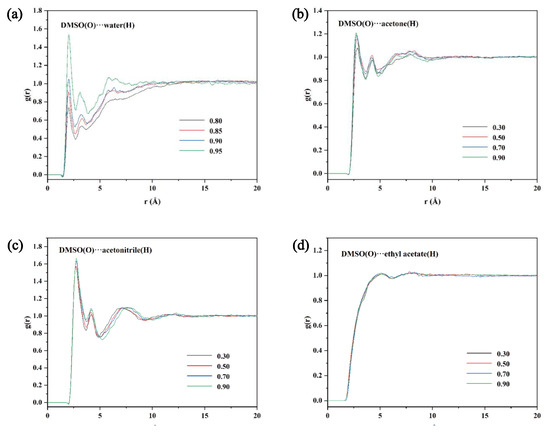 RDF plots of water (a), acetone (b), acetonitrile (c), and ethyl acetate (d) with different mass fraction of DMSO at 303.1 K.