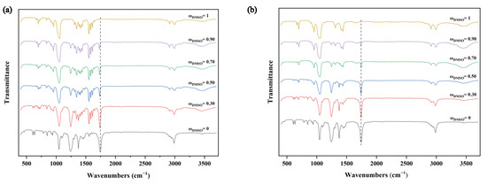 In addition, the co-solvent phenomenon of the DMSO + ethyl acetate system was further investigated using infrared spectroscopy experiments. Figure 6a shows the comparative IR spectrum of TNBP dissolved in mixed solutions with different mass fractions of DMSO. As ωDMSO increases, the carbonyl peak gradually moves toward the lower wave number, and the positions of the other peaks do not change. Considering that the nitro group’s oxygen atom in TNBP and ethyl acetate’s hydrogen atom form intermolecular hydrogen bonds, the electron absorption of the nitro group affects the carbonyl group in ethyl acetate, resulting in the apparent redshift of the peak. The above results prove the existence of hydrogen bonding between TNBP and the mixed solution. Figure 6b compares the IR spectra between the solvents and shows that all the carbonyl peaks are around 1742 cm−1 and do not shift, indicating little hydrogen bonding between the solvent–solvent. These are in good agreement with our calculation results.