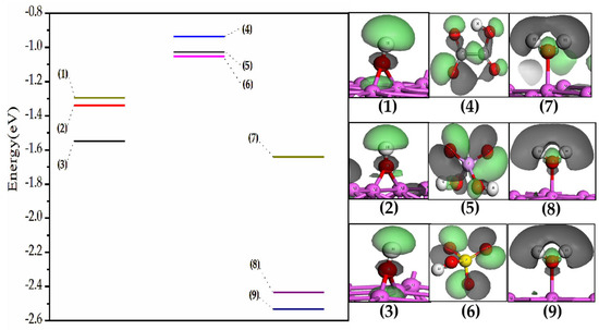 The energy levels and shapes of H in OH adsorbing on the anodic aluminum slabs: (1) (111)+1, (2) (110)+1, (3) (100)+1; the energy levels and shapes of HOMO of acid radicals: (4) HCO4−, (5) H2PO4−, (6) HSO4−; the energy levels and shapes of H in H2O adsorbing on the anodic aluminum slabs: (7) (110)+1, (8) (100)+1, (9) (111)+1.
