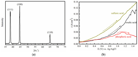 In order to verify the theoretic results, the anodic alumina will, respectively, grow in the three acid solutions. The aluminum foil with (100), (110) and (111) faces, see Figure 6a, is immersed into the acid solution to perform anodic polarization. In the sulfuric acid solution, the current rises with the increasing potential of the aluminum anode. In the oxalic acid solution, the change in current has a similar trend to that in the sulfuric acid solution, but the current of the oxalic acid solution is smaller than that of the sulfuric acid solution. In the phosphoric acid solution, the current maintains the smallest value, and the polarization curve is far under the curves generated in the oxalic and sulfuric acids solutions, as shown in Figure 6b. The reduction in the current arises from the coverage of the anodic surface by the growth of alumina. The polarization curves of Figure 6b imply that the phosphoric acid has the most powerful ability to extract H from the H2O adsorbed on the anodic surface, and to facilitate the growth of anodic alumina. The sulfuric acid is the weakest one. The oxalic acid lies between the former two acids.