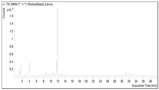 A 100 mg sample of dry plant extract was mixed with 10 mL of methanol and the solution was diluted to 2 mg/mL with 50% methanol in high-purity water. Afterward, the solution was filtered through a 0.22 mm filter and transferred to a vial prior to LC-ESI/MS/MS analysis. A Poroshell 120 EC-C18 column (100 mm 4.6 mm I.D., 2.7 mm) was used to chromatographically separate the components. The filtered plant mixture was passed down the column using a 0.1% formic acid carrier phase and 5 mM ammonium formate mobile phase, as well as mobile phase B consisting of 0.1% formic acid in methanol and 5 mM ammonium formate [].