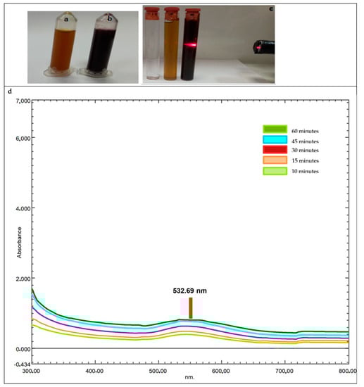 A pink-red color shift was seen 60 min after mixing the HAuCl4 solution and AC leaf extract. Peaks in surface plasmon resonance (SPR) occur when metal nanoparticles are produced. UV-visible spectroscopy was used to identify the distinctive gold nanoparticle SPR pattern (Figure 2). The time-dependent (10–60 min) change in the UV-Vis spectrum of gold nanoparticles synthesized from an aqueous leaf extract of AC using 25 mM HAuCl4 as the gold precursor is shown in Figure 2. The prominent SPR band that appears at 532.7 nm when 30 mL of the plant extract was combined with 120 mL of tetra chloroauric (III) acid solution (25 mM) confirmed the synthesis of AuNPs (Figure 2d). In Figure 2c, the Tyndall effect was observed, as a macroscopic observation confirming the presence of a colloidal system with the formation of the AC-AuNPs as a result of synthesis [,].