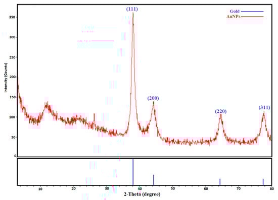 The crystalline nature and elemental content of the produced nanoparticles were determined using X-ray diffraction (XRD) (Figure 3). The face-centered cubic crystalline (FCC) structure of the gold nanoparticles was determined via the XRD spectrum, which revealed four diffraction bands at 2theta = 38.10°, 44.40°, 64.80°, and 77.86°. These were the typical Bragg’s diffraction planes (111°, 200°, 220°, and 310°) of the AuNPs (Figure 2). Our findings were consistent with previous reports [,]. The presence of small weak peaks that did not affect the peak width next to the peaks of high wide-angle Bragg angles indicated that phytochemicals in organic form played a role in stability. Thus, it was obvious from the XRD pattern that the Au nanoparticles generated via the reduction of AuCl4 ions by the aqueous extract of A. communis leaves were crystalline in form. The widening of the Bragg peaks was an indication of the existence of nanoparticles. Using the Debye-equation Scherrer’s in Formula (1) and the width of the (111°) Bragg reflection, the mean particle size was calculated to be 24.3 nm, which was in agreement with the FESEM findings.