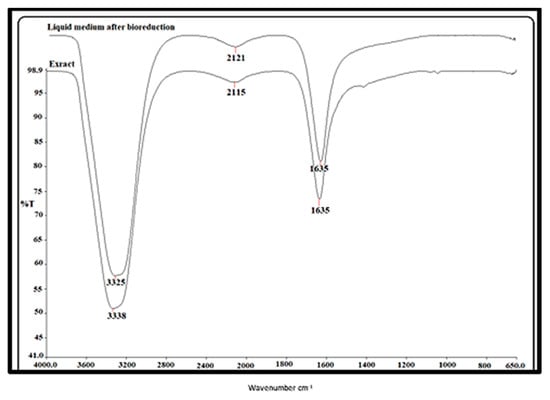 The various functions involved in the reduction of metal-to-metal nanoparticles were examined using FTIR analysis. Figure 4 displays the IR spectra of the biogenic gold nanoparticles and Amygdalus communis leaf extract. The FTIR spectrum of the gold nanoparticles produced by the plant extract is represented in Figure 4. Three prominent bands at wave numbers 3337.93–3324.68, 2120.51–2115.25, and 1635.12–1634.97 cm−1 that showed some shift in the corresponding gold nanoparticles were observed in the aqueous extract of Amygdalus communis and liquid medium (after bioreduction) (Figure 4). These peaks may have been attributable to the ester bonds in polyphenolic compounds, the OH-stretching vibration of phenolic compounds, and the carbonyl group stretching vibration, respectively. The O–H, alkyne (–C=C–), and amine (–NO) groups produced by the bioreduction of +3 valent Au metal in the aqueous medium to form 0 valence AuNPs demonstrated that they could be responsible for the stability [,,].