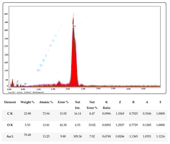 The EDX spectrum of the synthesized gold nanoparticles showed a prominent band of approximately 2–2.5 keV, showing that elemental gold was a significant constituent of the gold nanoparticles. At 0.2 and 0.5 keV, respectively, some faint signals from C and O were also observed. These signals might have originated from the capping biomolecules and carbon-supported gold grid that were utilized to load the samples or the presence of phytochemicals (Figure 5) [,].