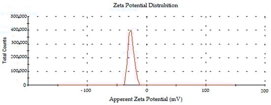 The zeta potential is a parameter that represents a particle’s charge and indicates the colloidal system’s potential stability. The zeta potential value is important for understanding and forecasting interactions between particles in suspension, and this notion is used in the study of cell adhesion, which is associated with surface charge features. The density-dependent surface charge and size distributions of the AC-AuNPs generated with AC leaf extract are shown in Figure 6 and Figure 7. The surface charge of the AC-AuNPs was found to be −27.7 ± 5.0 mV in the zeta potential measurement (Figure 7). Plant compounds actively contributed to the development of negative surface charges. The absence of conditions such as aggregation and fluctuation—both of which have detrimental impacts on stability—was made possible by the fact that the surface charge distribution was solely in the negative charge range. The negative surface charge also positively contributed to pH stability. In addition, the stability of the AuNP as a therapeutic agent is important for drug transport systems into the cell or in blood circulation for medical applications [,,,].