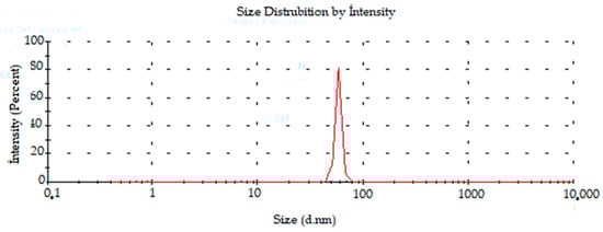 In previous experiments investigating the green synthesis of AuNPs, the surface charges of AuNPs synthesized with Mimusops elengi raw fruit extract, Borassus flabellifer fruit extract, and Gracilaria verrucosa extract were reported to be −22.0, −31.5, and −21.3 mV respectively [,,]. It was determined by DLS that the average size distribution of the synthesized AC-AuNPs was 58.30 ± 3.6 d.nm, as shown in Figure 8.