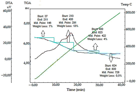The resistance of the synthesized AC-AuNPs to temperature fluctuations was measured by assessing the findings of the TGA-DTA study performed in the 0–800 °C range. As a result of temperature variations, mass loss was detected at four separate sites. The first mass loss (7%) was thought to be produced by adsorbed water, while the second (13%), third (4%), and fourth (0.4%) mass losses were thought to be caused by bioorganic molecules, namely phytochemicals (Table 2, Figure 9) []. This demonstrated the existence of phytochemicals around the nanoparticles and that they were responsible for the stability due to the phytochemicals’ negative surface charge.