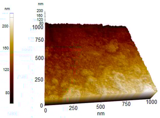 An AFM image demonstrating the shape, topographic, and size distributions of the synthesized AC-AuNPs is presented in Figure 10. It was observed that the AC-AuNPs had dimensions below 60 nm, a spherical appearance, and were monodisperse [,]. The size distribution of 58 nm shown in Figure 8 supported this finding. The fact that only a negative charge of −27.7 mV was detected, given in Figure 7, explained these results. In addition, the FESEM and TEM micrographs given in Figure 6 confirmed these findings for both the spherical morphological structure and single size distribution.