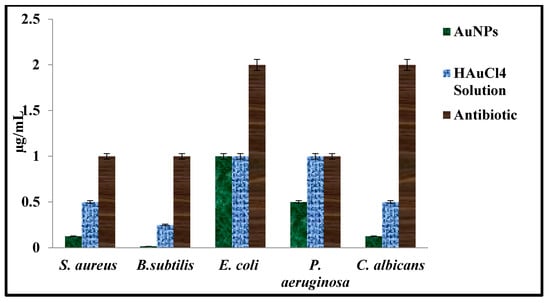 The antimicrobial suppressive effects of the AC-AuNPs, HAuCl4 solution, and standard antibiotics on human pathogen growth were evaluated by determining the MIC value using microdilution methods. It was determined that 0.50–1.00 µg mL−1 concentrations for gram-negative strains were effective MIC values for growth suppression. On the other hand, 0.02–0.12 and 0.12 µg mL−1 concentrations were determined as effective growth suppression concentrations for gram-positive strains, and C. albicans yeast, respectively. The AC-AuNPs had suppressive effects on the E. coli strain at lower concentrations than antibiotics and at the same concentration as the HAuCl4 solution. The AC-AuNPs were demonstrated to decrease the growth of other tested pathogens at extremely low concentrations compared to the standard antibiotics and HAuCl4 solution (Table 3, Figure 11).