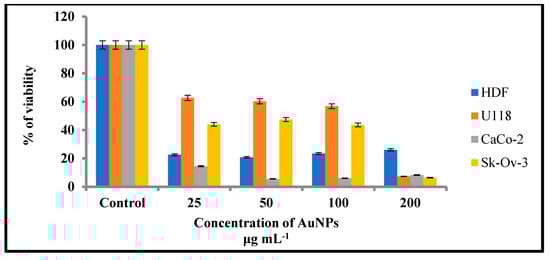 Gold nanoparticles have shown potential in cancer therapy. AuNPs offer several distinguishing characteristics, including tiny size, non-toxicity, and non-immunogenicity, which make them ideal candidates for targeted drug delivery systems. As tumor-targeting delivery vectors become smaller, the potential to evade the body’s natural barriers and impediments become more feasible. In the current study, the cytotoxic efficiency of the AC-AuNPs was tested against colorectal adenocarcinoma (Caco-2), glioblastoma (U118), and human ovarian sarcoma (Sk-ov-3) cancer cell lines and human dermal fibroblasts (HDF; healthy cells) using the MTT assay. The AC-AuNPs in the concentration range of 25–100 g mL−1 produced the greatest anticancer effects on CaCo-2 cells, as shown in Table 5 and Figure 12. This impact occurred at a rate of 85.49–94.49% viability suppression. The AC-AuNPs also had a substantial anticancer impact on Skov-3 and U118 cancer cell lines, decreasing their viability by 55.98–93.56% and 37.36–92.71%, respectively. Shape, size, concentration, surface charge, and contact duration are all important factors in nanoparticle toxicity []. Large pores (which facilitate the flow of chemicals such as nutrients and oxygen) can be seen in the vascular arteries of tumor and inflammatory tissues. Nanoparticles can easily aggregate and pass through these wide holes. Small AuNPs may easily pass through the cell membrane and produce effects such as generating ROS inside the cell and inducing apoptosis by activating caspase enzymes [].