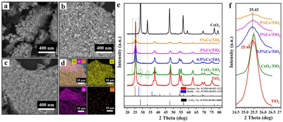 The surface morphology of the pure TiO2, Ce-doped TiO2 (Ce/TiO2, 0.5% Ce), and CeO2-mixed TiO2 (CeO2-TiO2) samples were observed by SEM, and their crystal structures were identified by XRD measurement, as shown in Figure 1. The elemental mapping results of the as-prepared Ce/TiO2 sample demonstrated a uniform distribution of Ce in TiO2, as shown in Figure 1d. As shown in the SEM and EDS mapping images, Ce/TiO2 consists of TiO2 nanoparticles with a homogeneous distribution of Ce elements. The relative amount of the Ce element in Ce/TiO2 is close to that in CeO2-TiO2, as shown in Table S1.