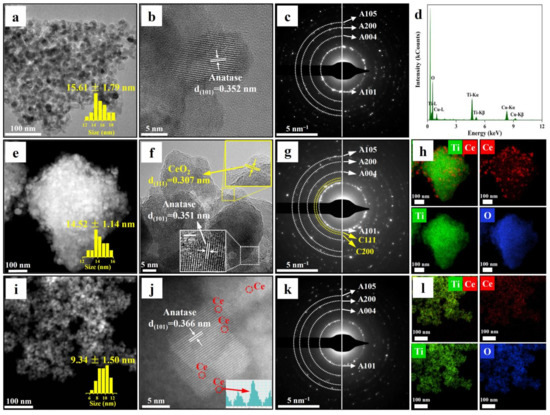 TEM images, HRTEM images, SAED patterns, and elemental mapping of (a–d) pure TiO2; (e–h) CeO2-TiO2; (i–l) Ce/TiO2, respectively.