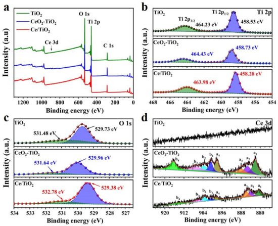 For obtaining the chemical composition and valence state of the Ce-doped TiO2, X-ray photoelectron spectroscopy (XPS) measurements were conducted, as shown in Figure 3. The pure TiO2, Ce/TiO2, and CeO2-TiO2 were all composed of O, Ti, and C, as shown in the survey spectra (Figure 3a). The Ti 2p peaks at 458.28 eV and 463.98 eV are attributed to Ti 2p3/2 and Ti 2p1/2, respectively, indicating the Ti4+ state in the Ce/TiO2, as shown in Figure 3b. A slight shift in the Ti 2p in the Ce-doped TiO2 towards a lower value compared to that of pure TiO2 could be due to the interaction between Ti4+ and Ce3+ or Ce4+ species [25]. In Figure 3c, the O 1s peak at 529.73 eV corresponds to the lattice oxygen of TiO2, while the peak at 531.48 eV corresponds to the surface-adsorbed oxygen species [26]. The O 1s spectrum of the Ce/TiO2 had a smaller peak area at 532.78 eV compared to that of pure TiO2, which indicates a reduction in oxygen vacancies. In addition, the O 1s peak slightly shifted towards the lower binding energy region due to the Ce doping. The Ce 3d spectra (Figure 3d) show eight fitting peaks, where a and b correspond to the two spin orbitals (Ce 3d5/2 and Ce 3d3/2) in the Ce/TiO2, respectively [27]. The peaks a2 and b2 are attributed to Ce3+, while the others correspond to Ce4+. The relative content of Ce ions can be calculated from the ratio of the fitting peak area. The relative content of Ce3+ in the Ce/TiO2 (30.4%) was higher than that of the CeO2-TiO2 (24.6%), indicating that more Ce3+ ions were retained in the synchronous doping process. The higher content of Ce3+ in Ce/TiO2 plays a key role in the formation of oxygen defects and improves the redox conversion between Ce3+ and Ce4+ [28].