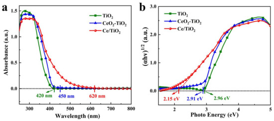 The UV-Vis absorbance spectra in Figure 4a show the redshift of the absorption edge to the visible region in TiO2 after Ce doping, which may be due to the Ce 4f intermediate energy level inside the band gap of TiO2 [25]. The Tauc plot extracted from the UV-Vis absorbance spectra exhibits the band gap of the samples, as shown in Figure 4b. The band gaps of the pure TiO2, CeO2-TiO2, and Ce/TiO2 were 2.96 eV, 2.91 eV, and 2.15 eV, respectively.