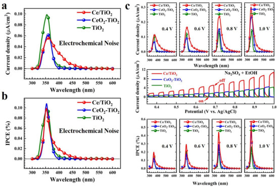 The photocurrent densities versus the monochromatic light of the samples were measured in electrochemical noise (ECN) mode, which is a nondestructive and in situ monitoring technique to investigate the spontaneous electrochemical reactions of photoanodes [16,32], as shown in Figure 7a. The photocurrent density of the Ce/TiO2 was slightly lower than that of the pure TiO2 under the UV light region. It is worth noting that the Ce/TiO2 showed visible light absorption up to 500 nm, while the pure TiO2 and CeO2-TiO2 exhibited no obvious response under the visible light region. The successful Ce doping highly improves the visible light utilization efficiency of TiO2. The incident photon-to-current efficiencies (IPCEs) spectra were obtained from the photocurrent–wavelength curves, as shown in Figure 7b. The Ce/TiO2 had the highest IPCE value of 0.10% in the region of 350 nm and an obvious visible light response. The Ce/TiO2 still exhibited an IPCE value of 0.02% at 400 nm. The photocurrents and IPCE versus monochromatic light of Ce/TiO2 under applied voltages are shown in Figure 7c. The photocurrent response of the Ce/TiO2 increased with bias, which is consistent with the results of the LSV curves.