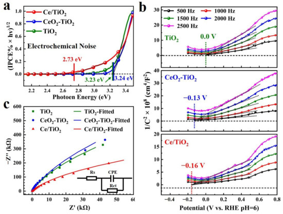 (a) The band gap determination extracted from the IPCE spectra as a function of (IPCE% × hv)1/2 vs. hv; (b) Mott–Schottky plots; (c) EIS Nyquist plots with the fitted equivalent circuit.