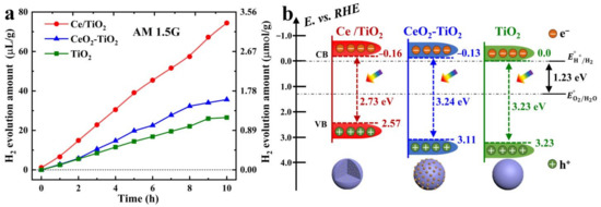 Based on the above results, the mechanism of Ce doping in TiO2 for an improved photocatalytic performance was proposed. The energy band diagram of the pure TiO2, CeO2-TiO2, and Ce/TiO2 is illustrated in Figure 9b. Ce doping in the lattice of TiO2 narrows the band gap of TiO2, resulting in a visible-light response. The negatively shifted conduction band in Ce/TiO2 improves the carrier transfer process and reduces the recombination of photogenerated electron/hole pairs. Therefore, Ce/TiO2 exhibits a high photocatalytic performance for H2 evolution from water splitting.