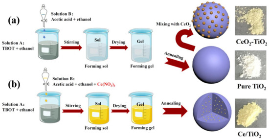 Synthesis diagram of (a) pure TiO2 and CeO2-TiO2; (b) Ce/TiO2.