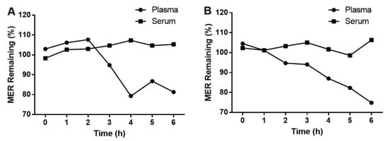 - Mortensen, J.S.; Jensen, B.P. Preanalytical Stability of Piperacillin, Tazobactam, Meropenem, and Ceftazidime in Plasma and Whole Blood Using Liquid Chromatography-Tandem Mass Spectrometry. Ther. Drug Monit. 2019, 41, 538–543. [Google Scholar] [CrossRef] [PubMed]