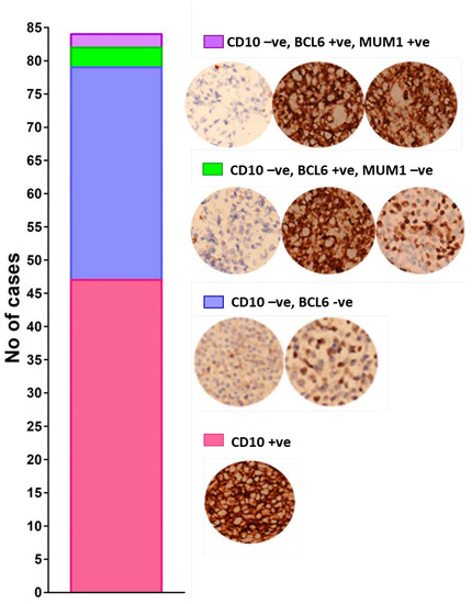 Stacked bar showing the distribution of expression of markers in the recruited DLBCL cases. Representative micrographs of CD10 + ve GCB (Top), CD10-ve, BCL-6-ve ABC (2nd) CD10-ve, BCL-6 + ve, MUM1-ve (3rd) and CD10-ve, BCL-6 + ve and MUM1 + ve (bottom) are also shown, corresponding to the colors of the stacks.