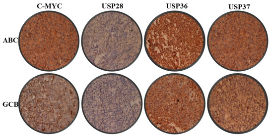 Immunohistochemistry of DLBCL samples. Representative histomicrographs (400×) of the ABC and GCB subtypes of DLBCL probed with c-MYC, USP28, USP36 and USP37 antibodies as labeled.