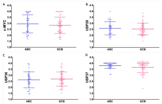 Expression of c-MYC and associated USPs were estimated digitally from immunohistomicrographs (Figure 2). Expression of all examined USPs and c-MYC was found comparable in both the ABC and GCB subtypes of DLBCL without any statistically significant difference (Figure 3).