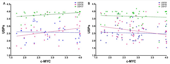 Correlation between c-MYC and USPs expression. Correlation between expression of c-MYC and USPs, USP28 (Blue), USP36 (Red) and USP37 (Green) are shown in the (A) ABC and (B) GCB subtypes of DLBCL. Data points are indicated with the empty circles of corresponding colors.