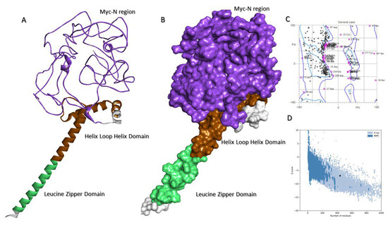 Molecular structure of c-MYC. (A) Full-length ribbon structure of c-MYC, where domains are colored differently: MYC-N region (purple), Helix Loop Helix (brown) and Leucine Zipper (aqua). (B) Surface topology of c-MYC structure with domains are colored correspondingly. (C) Ramachandran plot and (D) ProSA graph are shown, where black spots in the ProSA graph indicate z scores of the modeled structure over the structures, resolved experimentally by NMR (dark blue) and X-ray crystallography (light blue).