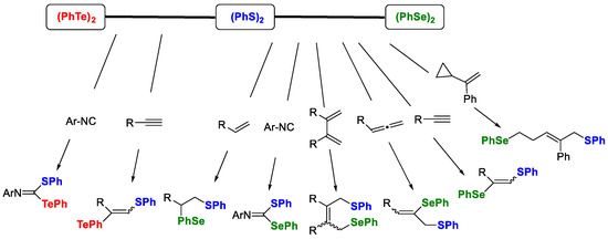The concept of the “heteroatom mixed system” could be applied to a variety of unsaturated compounds such as alkenes, alkynes, allenes, vinylcyclopropanes, and isocyanides, as shown in Scheme 2 [29,31,32,33,34]. In the photoinduced thioselenation reactions, 1,1-addition for isocyanide, 1,2-addition for alkyne and allene, 1,4-addition for conjugate diene, and 1,5-addition for vinylcyclopropane successfully proceeded with excellent regioselectivity. Furthermore, the photoinduced addition to alkyne and isocyanide was also attained by combining (PhS)2 and (PhTe)2, affording the corresponding thiotelluration products.