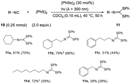 As shown in Table 4, the reaction of cyclohexyl isocyanide 10a (0.25 mmol) with (PhS)2 (2.0 equiv.) in the presence of (PhSe)2 (30 mol%) under light afforded the 1,1-addition product 11a in good yield (entry 1). High concentration of the starting materials led to the corresponding dithiolation product 11a in up to 81% yield (entry 3). It is noteworthy that the thioselenation adduct 12a was obtained in trace yields under the conditions of entries 1–3; therefore, the transformation of the in situ-generated 12a to the dithiolation adduct 11a might proceed very smoothly under these conditions. In the absence of (PhSe)2, the yield of 11a dramatically decreased, indicating that the presence of catalytic amounts of (PhSe)2 was essential for the efficient transformation of 10a to 11a (entry 4).