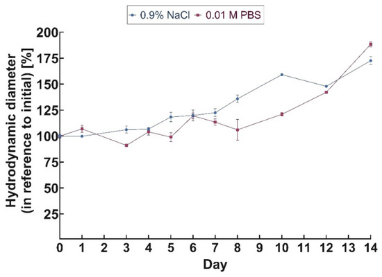 Changes in hydrodynamic diameter of DOX-PEG-AuNPs-PEG-Tmab incubated in two medias—0.9% NaCl and 0.01 M PBS at 37 °C as a function of time.