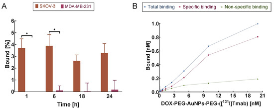 Percentage bioconjugate specificity of DOX–PEG–AuNPs–PEG–([131I]trastuzumab) obtained for the SKOV-3 (HER2+) and MDA-MB-231 (HER2−) cell lines (A). Data were compared using Student’s t-test (* p < 0.05). Binding studies of DOX–PEG–AuNPs–PEG–([131I]Tmab) on SKOV-3 (HER2+) (B).