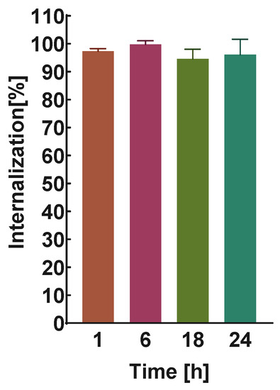 The internalization kinetics of DOX–PEG–AuNPs–PEG–([131I]Tmab) in SKOV-3 cells were investigated at four time points—1 h, 6 h, 18 h, and 24 h. As shown in Figure 5, more than 97% of the bioconjugate was internalized after 1 h and remained at a comparable level for up to 24 h. Conjugation of Tmab to AuNPs did not change the internalization properties of the monoclonal antibody, which were previously confirmed [18,19,20,22,23]. Due to the lack of specific binding, no internalization study was carried out on MDA-MB-231 cells.