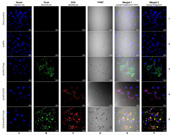 Furthermore, to confirm the internalization of the bioconjugate in SKOV-3 cells, a confocal microscopy imaging experiment was performed. Cells were treated with AuNPs–PEG–COOHa, AuNPs–PEG–Tmab, AuNPs–PEG–DOX, and finally with the bioconjugate DOX–PEG–AuNPs–PEG–Tmab. As shown in Figure 6, both AuNPs–PEG–Tmab and the bioconjugate internalized and localized in the cytoplasm of SKOV-3 cells, which was in agreement with the results obtained by the radiometric method. The less intensive dark spots observed in panels B/5 and C/5 as well as black dots in panel D/5 corresponded to AuNPs. The red fluorescence signal corresponded to DOX (panel C/4), while the green color was related to bound Tmab (panel B/3). In addition, the nuclei of their cells were stained with Hoechst 33,528 (blue fluorescence), which allowed precise observation of the localized bioconjugate. Merged signals (panels E/5, F/5) showed that DOX–AuNPs–Tmab penetrated SKOV-3 cells and localized in the perinuclear space. Moreover, the bioconjugate was detected in the nucleus, although it was rarely presented. As expected, free AuNPs (panel D/2) were internalized with low ability compared to the bioconjugate. A very low signal was detected inside the cells (panel E/2), which may suggest the passive transport of particles. The obtained results were consistent with our previously reported studies with the AuNPs–Tmab bioconjugate [19,20,21,24] as well as data published by other groups [22].