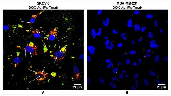 Confocal microscopy images of (A) SKOV-3 (HER2+) and (B) MDA-MB-231 (HER2−) cells treated with DOX–PEG–AuNPs–PEG–Tmab. Arrows mark the subcellular localization of the DOX–AuNPs–Tmab.